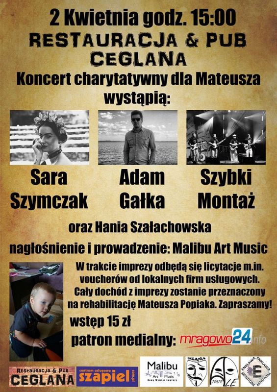 W niedzielę 2 kwietnia 2017 r. w godz. 15:00-19:00 odbędzie się Koncert charytatywny dla Mateusza. Zapraszamy do Restauracji Ceglana w Mrągowie przy ul. Warszawskiej 8.