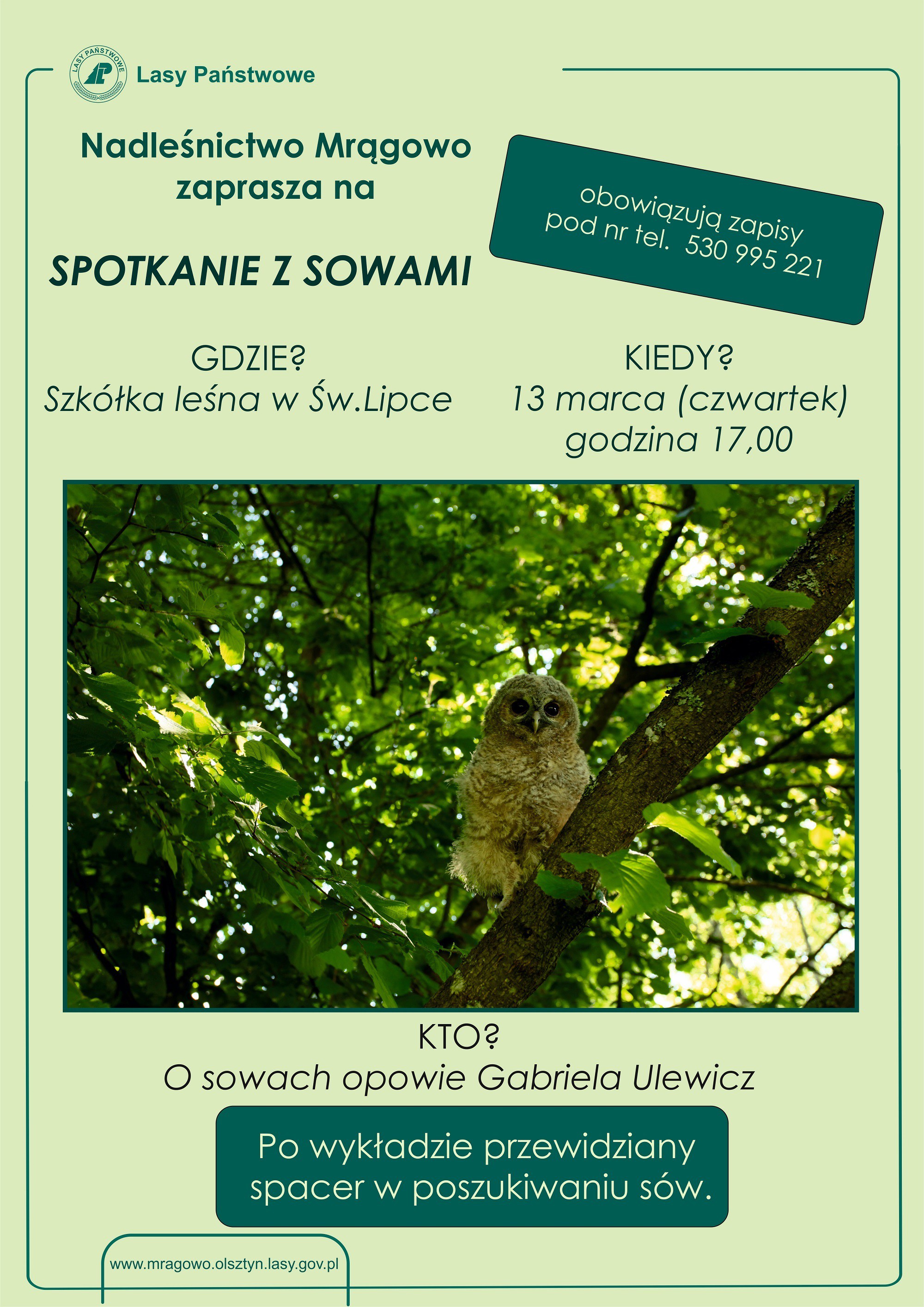 Nadleśnictwo Mrągowo zaprasza na Spotkanie z sowami, które odbędzie się w czwartek 13 marca 2025 r. na terenie Szkółki Leśnej w Świętej Lipce. Wykład rozpocznie się o godzinie 17.00, a poprowadzi go Gabriela Ulewicz, edukatorka Nadleśnictwa Mrągowo. Po prezentacji udamy się na spacer wokół szkółki leśnej w poszukiwaniu sów.