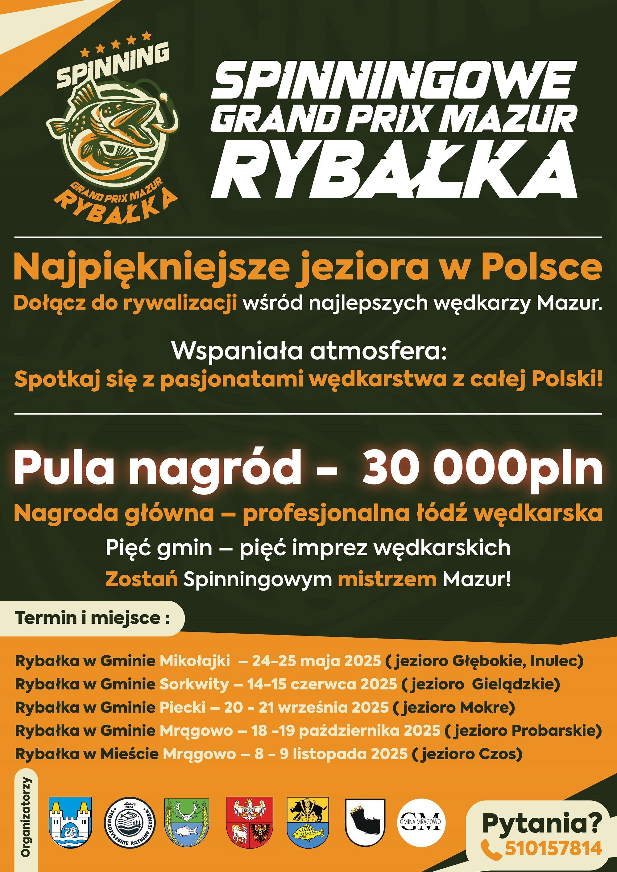 Powiat Mrągowski i Stowarzyszenie Ratujmy Jeziora, przy wsparciu Samorządu Województwa Warmińsko-Mazurskiego oraz Miasta Mrągowo i Gmin: Mrągowo, Piecki i Sorkwity organizują dla wszystkich miłośników wędkarstwa wyjątkowe wydarzenie – Spinningowe Grand Prix Mazur 2025. To niezapomniana rywalizacja, która odbywać się będzie na najpiękniejszych jeziorach Mazur.