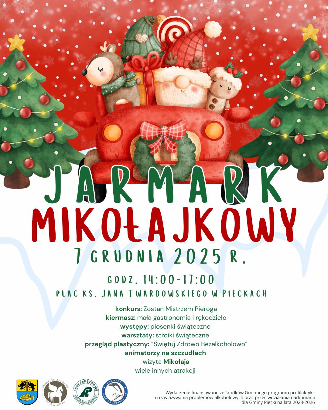 Gminny Ośrodek Kultury "Pegaz" w Pieckach zaprasza na Jarmark Mikołajkowy, który odbędzie się 7 grudnia 2025 roku na placu ks. Jana Twardowskiego w Pieckach w godzinach od 14:00 do 17:00.