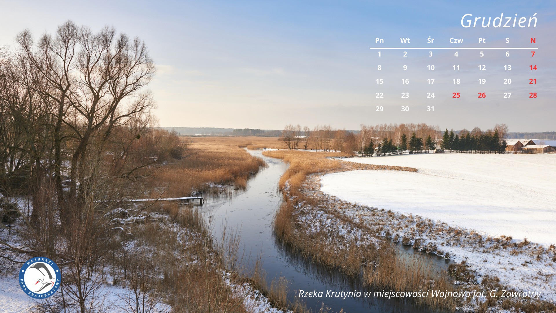 Przed nami ostatni miesiąc roku. Propozycją Mazurskiego Parku Krajobrazowego tapety na grudzień jest widok na rzekę Krutynię, uchwycony z wieży widokowej w miejscowości Wojnowo. W dalszym planie widać rozległe trzcinowiska ciągnące się wzdłuż biegu rzeki.