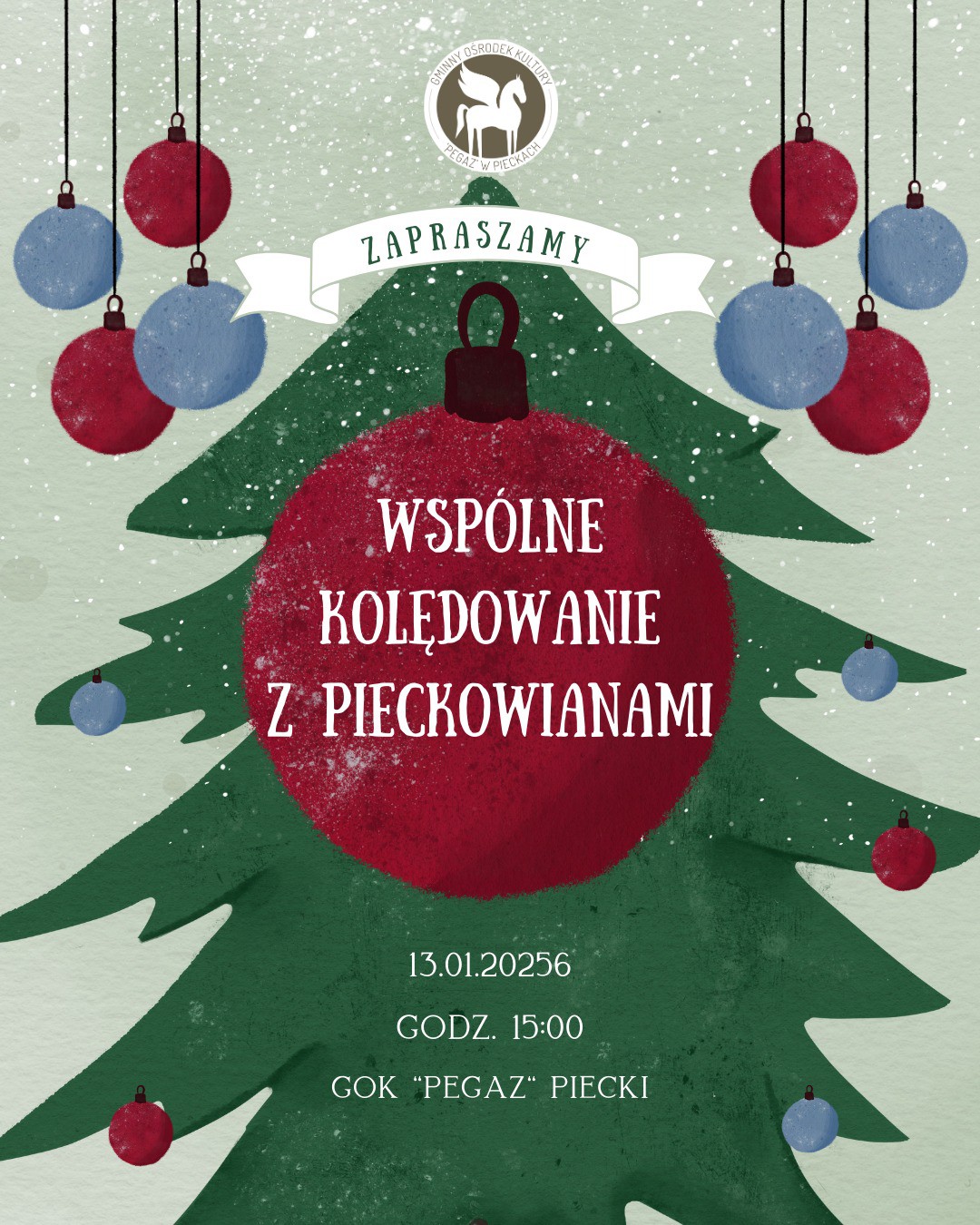 Gminny Ośrodek Kultury „Pegaz” w Pieckach serdecznie zaprasza na wspólne kolędowanie z zespołem Pieckowianie, które odbędzie się 13 stycznia 2026 roku w siedzibie GOK „Pegaz” w Pieckach.