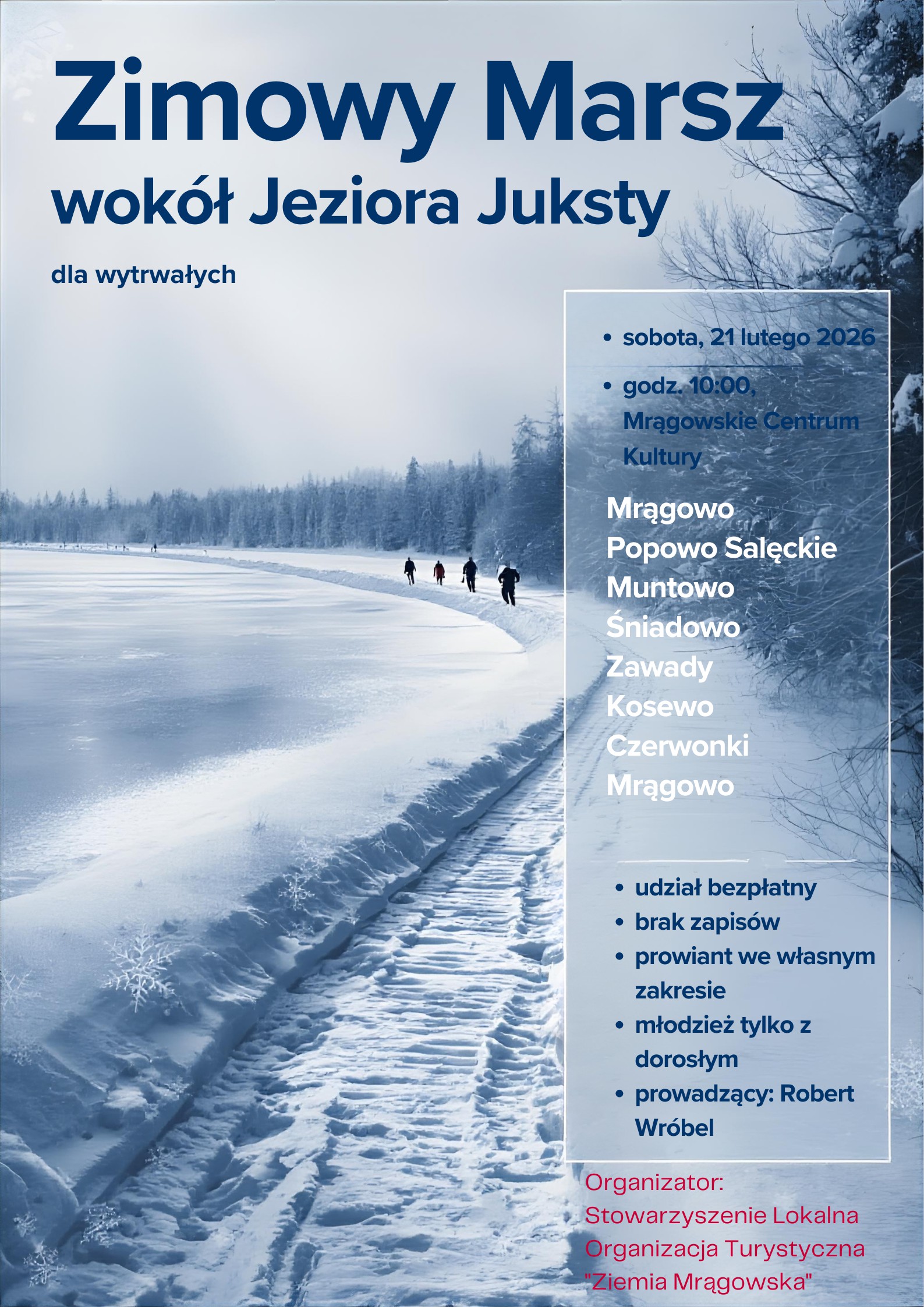 Zimowy Marsz wokół Jeziora Juksty to doskonała okazja, by aktywnie spędzić czas, podziwiając zimowe krajobrazy Mazur i sprawdzić swoją wytrzymałość na 25-kilometrowej trasie.