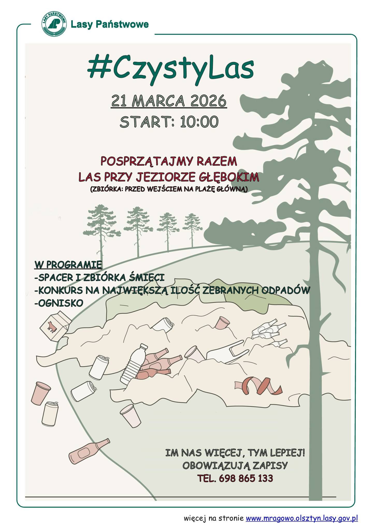 Posprzątamy las wzdłuż jeziora Głębokiego. Zbiórka odbędzie się przed wejściem na główną plażę (na górce) w sobotę 21 marca 2026 o godzinie 10:00.