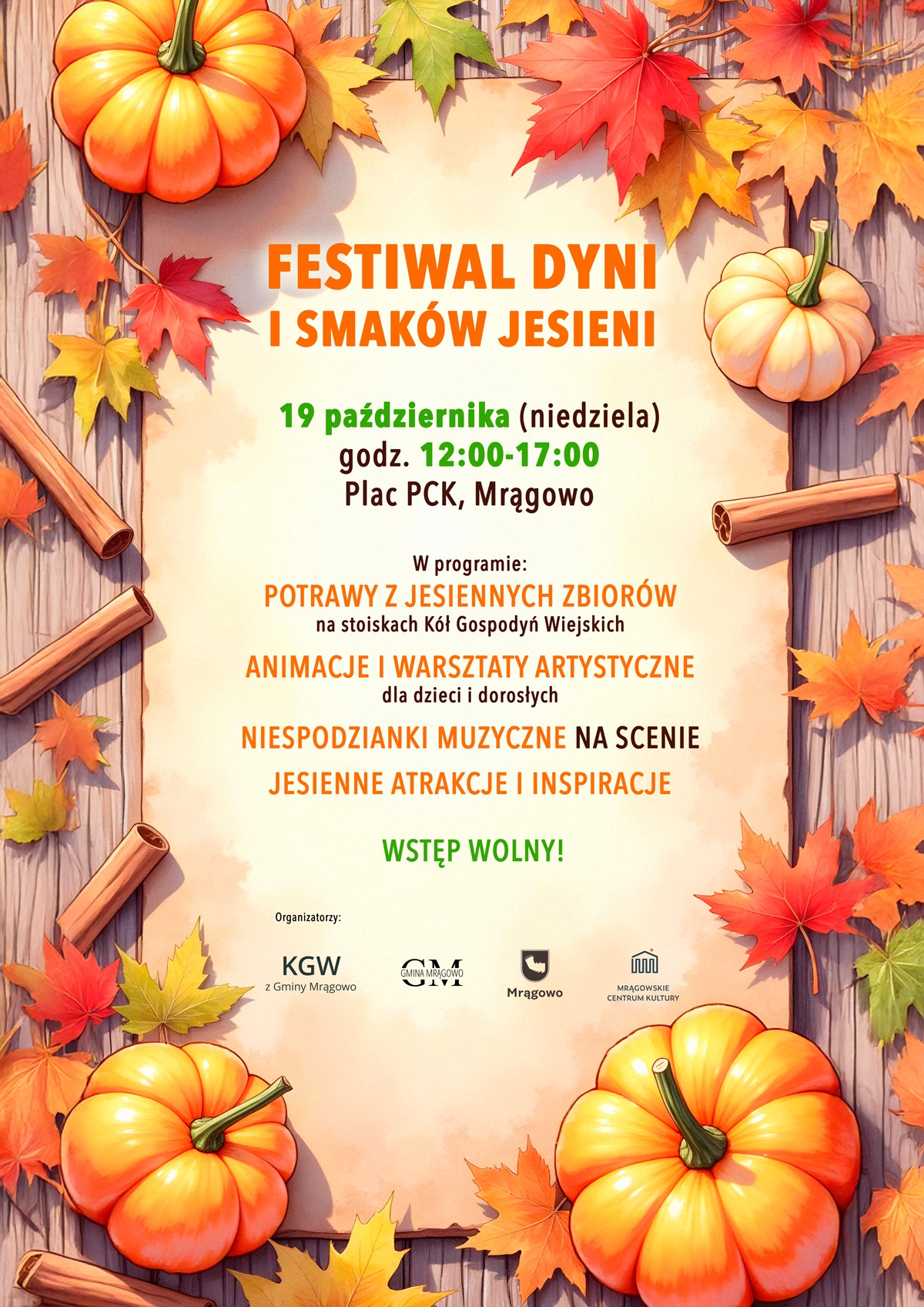 Zanurz się w wyjątkowy klimat złotej jesieni podczas pierwszej edycji Festiwalu Dyni i Smaków Jesieni w Mrągowie! Czeka na Ciebie prawdziwa uczta dla zmysłów – smaków, zapachów i kolorów!