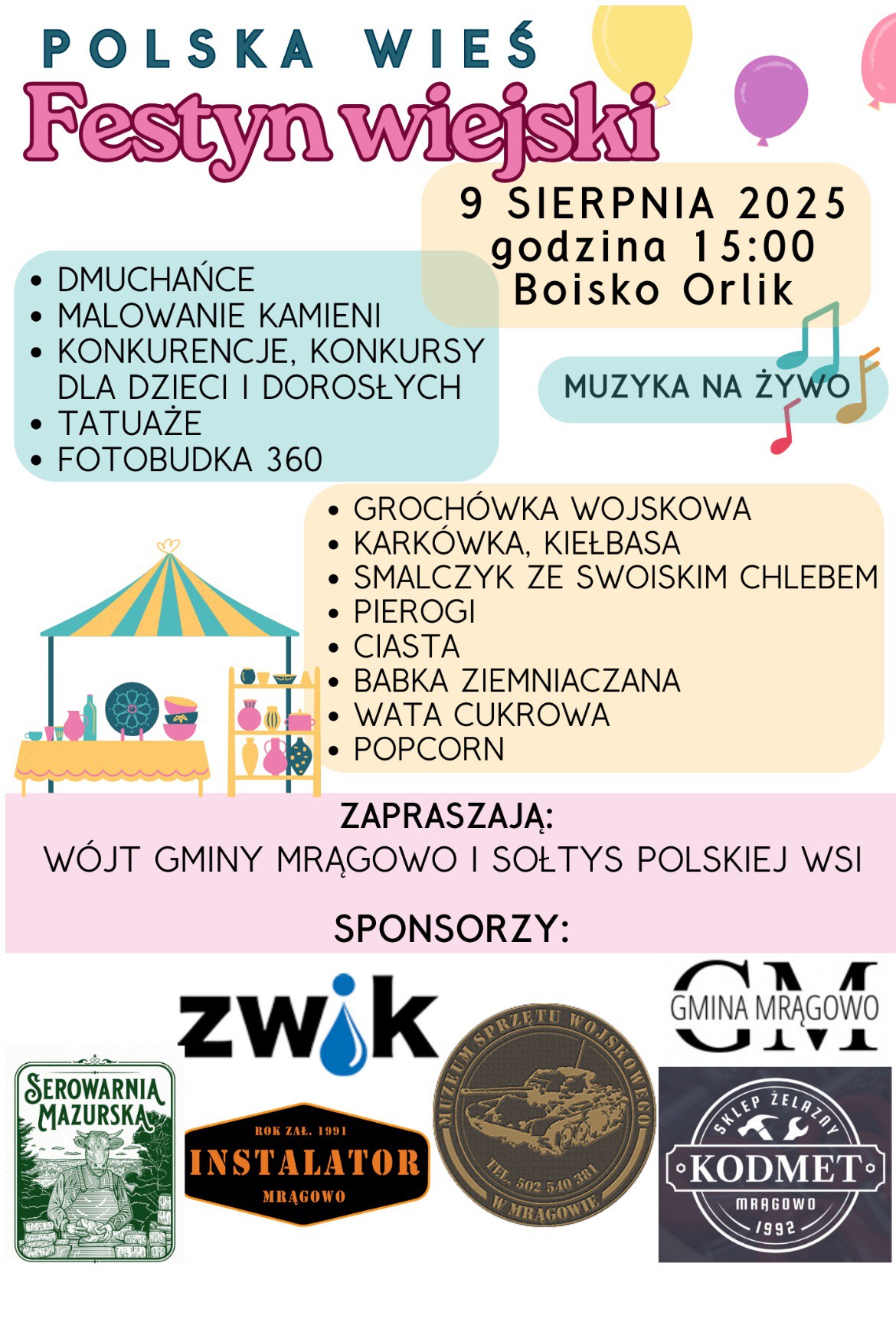W sobotę 9 sierpnia 2025 r. o godz. 15:00 zapraszamy na boisko Orlik w Polskiej Wsi w Gminie Mrągowo na Festyn wiejski.