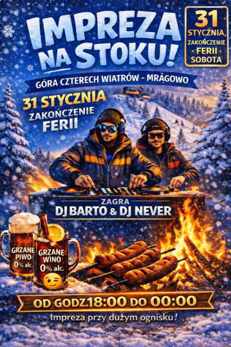 Startujemy o 18:00, a bawimy się aż do północy. To będzie wieczór pełen energii, śmiechu i zimowej magii. Jeśli ferie mają się skończyć, to tylko w takim stylu – głośno, radośnie i z przytupem!