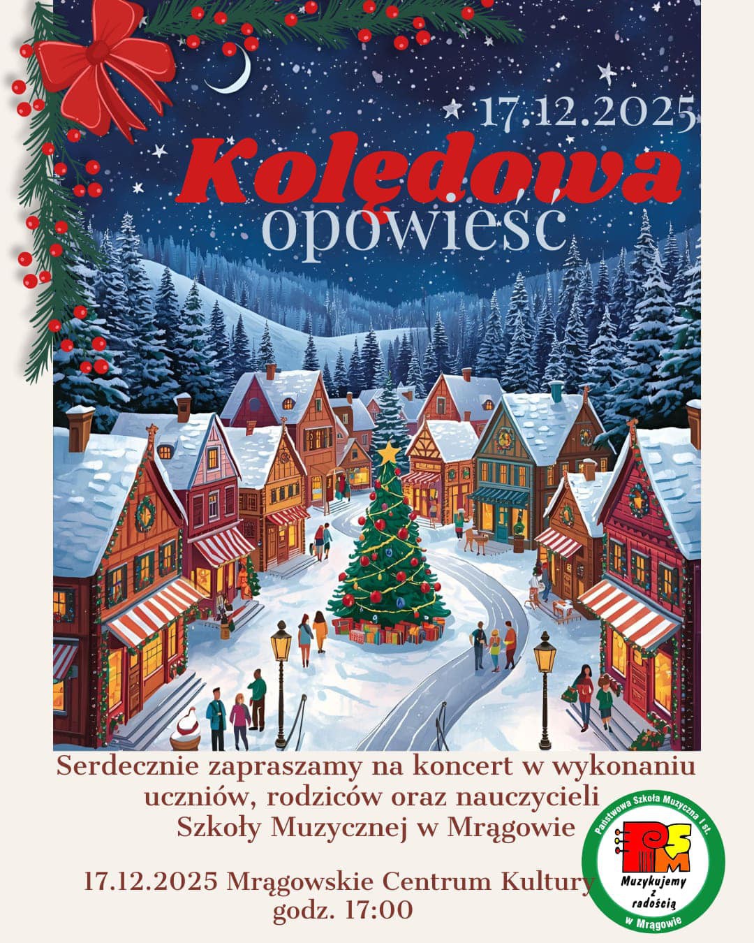 W środę, 17 grudnia 2025 r. o godz. 17:00, w sali widowiskowej Mrągowskiego Centrum Kultury, zabrzmią najpiękniejsze polskie i zagraniczne kolędy oraz pastorałki w wykonaniu uczniów, rodziców i nauczycieli szkoły.