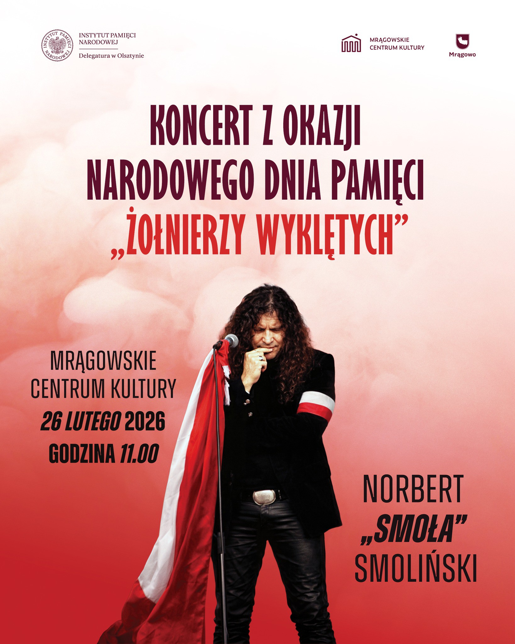 W czwartek 26 lutego 2026 r. o godz. 11.00 w Mrągowskim Centrum Kultury odbędzie się koncert Norberta „Smoły” Smolińskiego, przygotowany w ramach obchodów Narodowego Dnia Pamięci „Żołnierzy Wyklętych” – święta państwowego poświęconego żołnierzom antykomunistycznego i niepodległościowego podziemia.