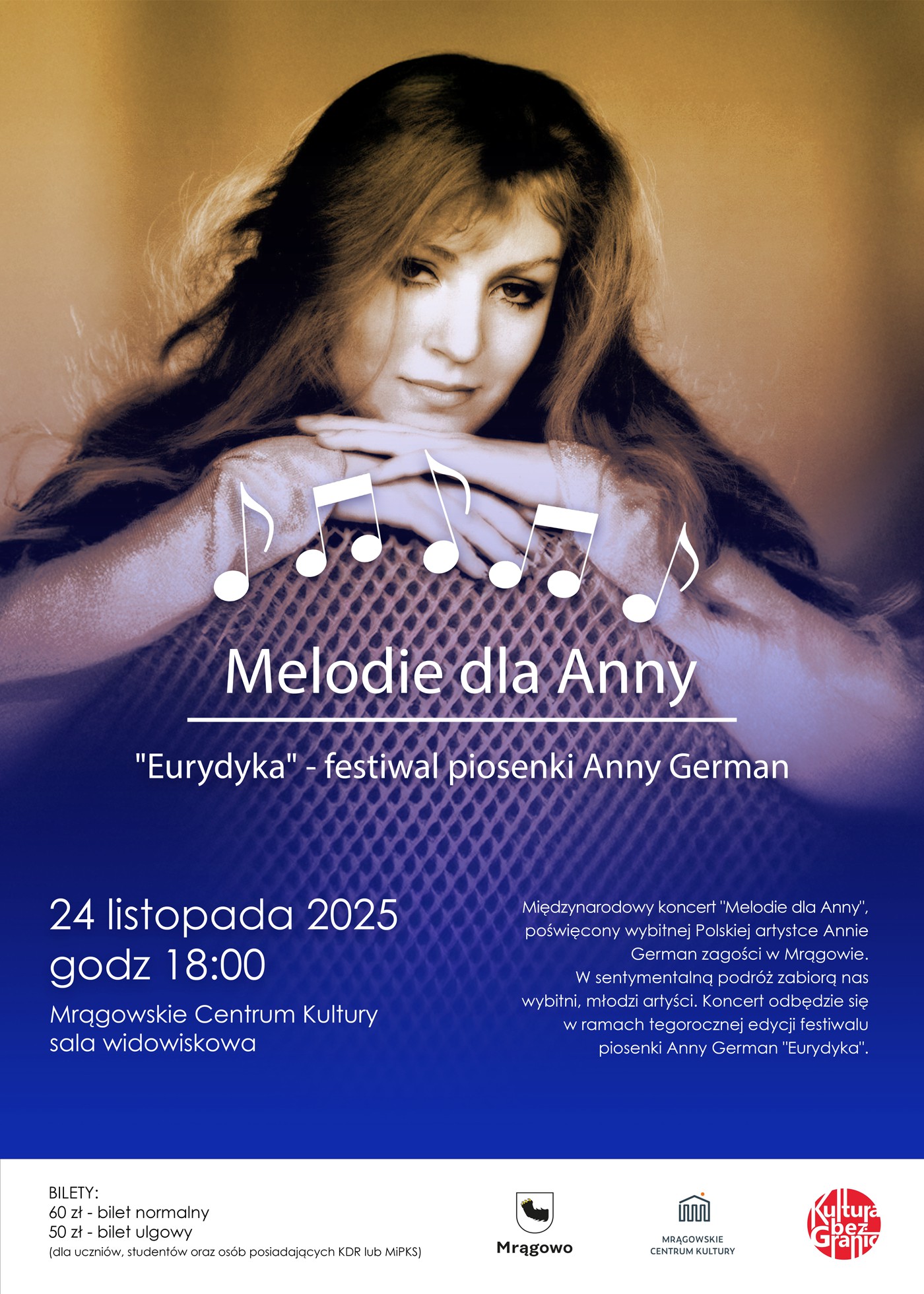 Mrągowskie Centrum Kultury zaprasza w poniedziałek 24 listopada 2025 r. o godz. 18.00 na wyjątkową, sentymentalną podróż w świat twórczości Anny German.