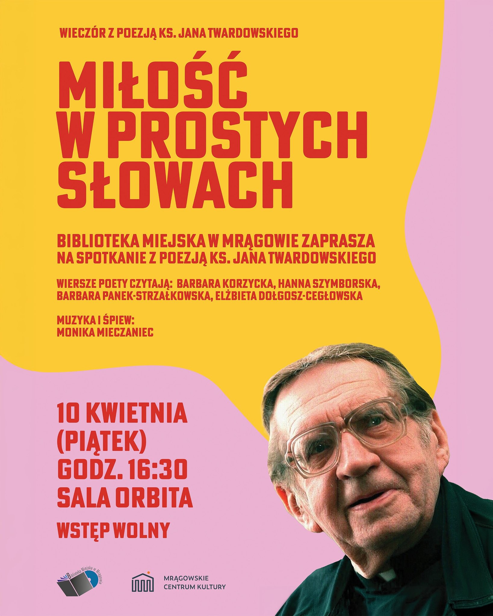 Serdecznie zapraszamy w piątek 10 kwietnia 2026 o godzinie 16:30 do sali Orbita Mrągowskiego Centrum Kultury na spotkanie z poezją, które stanie się chwilą refleksji, zadumy i duchowego wyciszenia.