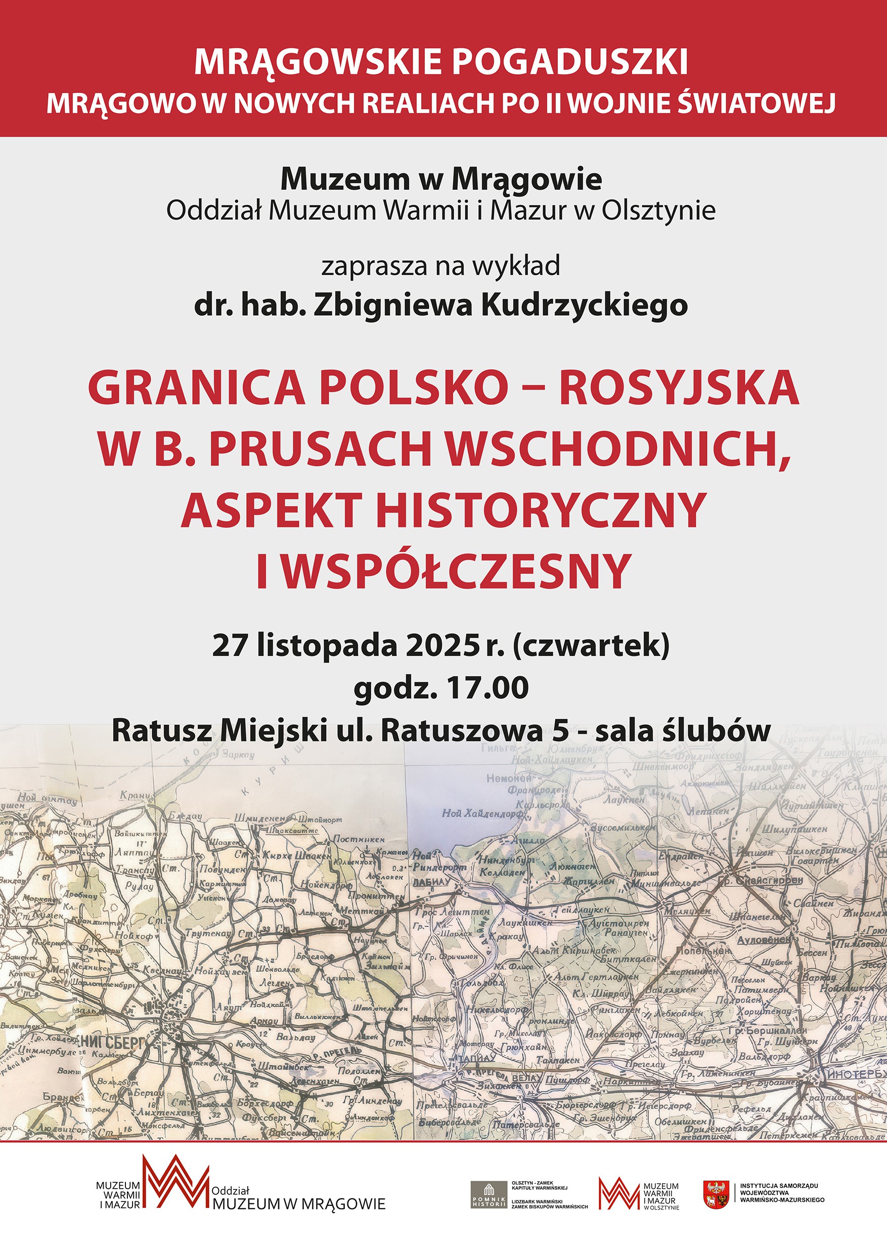 Muzeum w Mrągowie zaprasza na Mrągowskie Pogaduszki - Mrągowo w nowych realiach po II wojnie światowej. Wykładu udzieli dr hab. Zbigniew Kudrzycki "Granica polsko-rosyjska w byłych Prusach Wschodnich, aspekt historyczny i współczesny" - czwartek, 27 listopada 2025 r., godz. 17:00, Ratusz Miejski, ul. Ratuszowa 5 - sala ślubów.