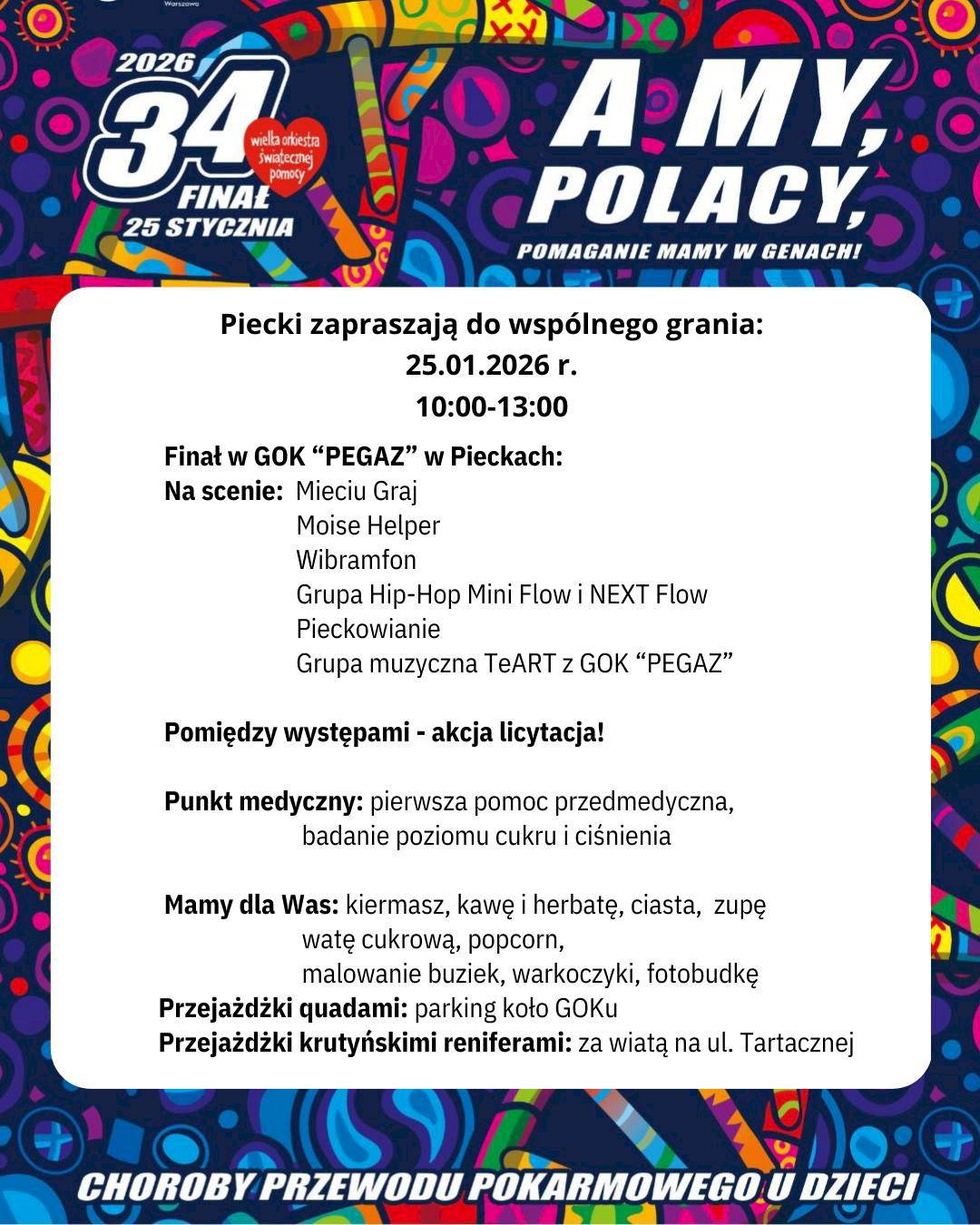 Już 25 stycznia 2026 roku w Gminnym Ośrodku Kultury „PEGAZ” w Pieckach odbędzie się 34. Finał Wielkiej Orkiestry Świątecznej Pomocy. W godzinach 10:00–13:00 mieszkańcy i goście będą mogli wspólnie przeżyć wyjątkowy dzień pełen muzyki, radości i pozytywnej energii.