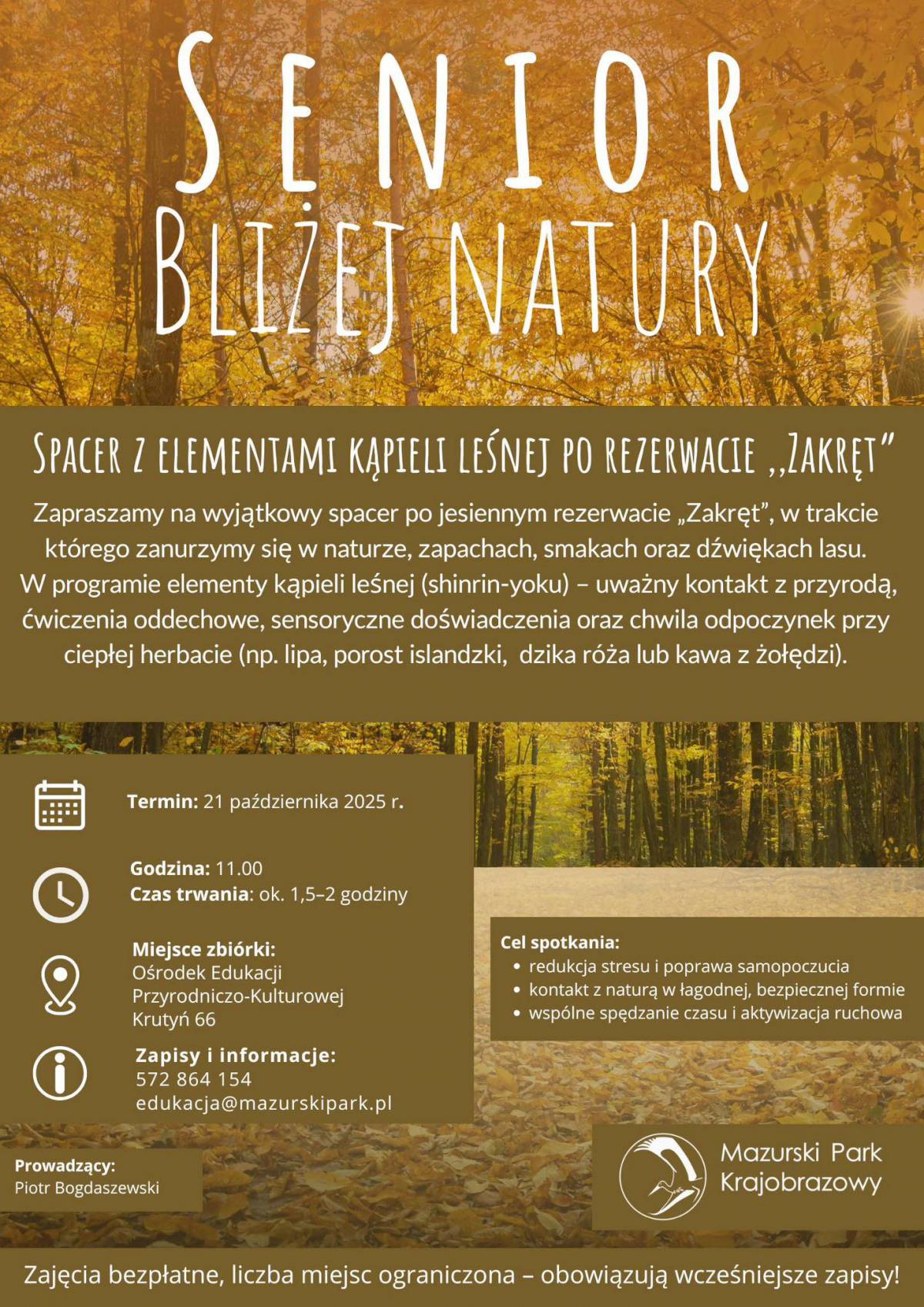 Będzie to wyjątkowy spacer po jesiennym rezerwacie „Zakręt”, w trakcie którego zanurzymy się w naturze, zapachach, smakach oraz dźwiękach lasu.