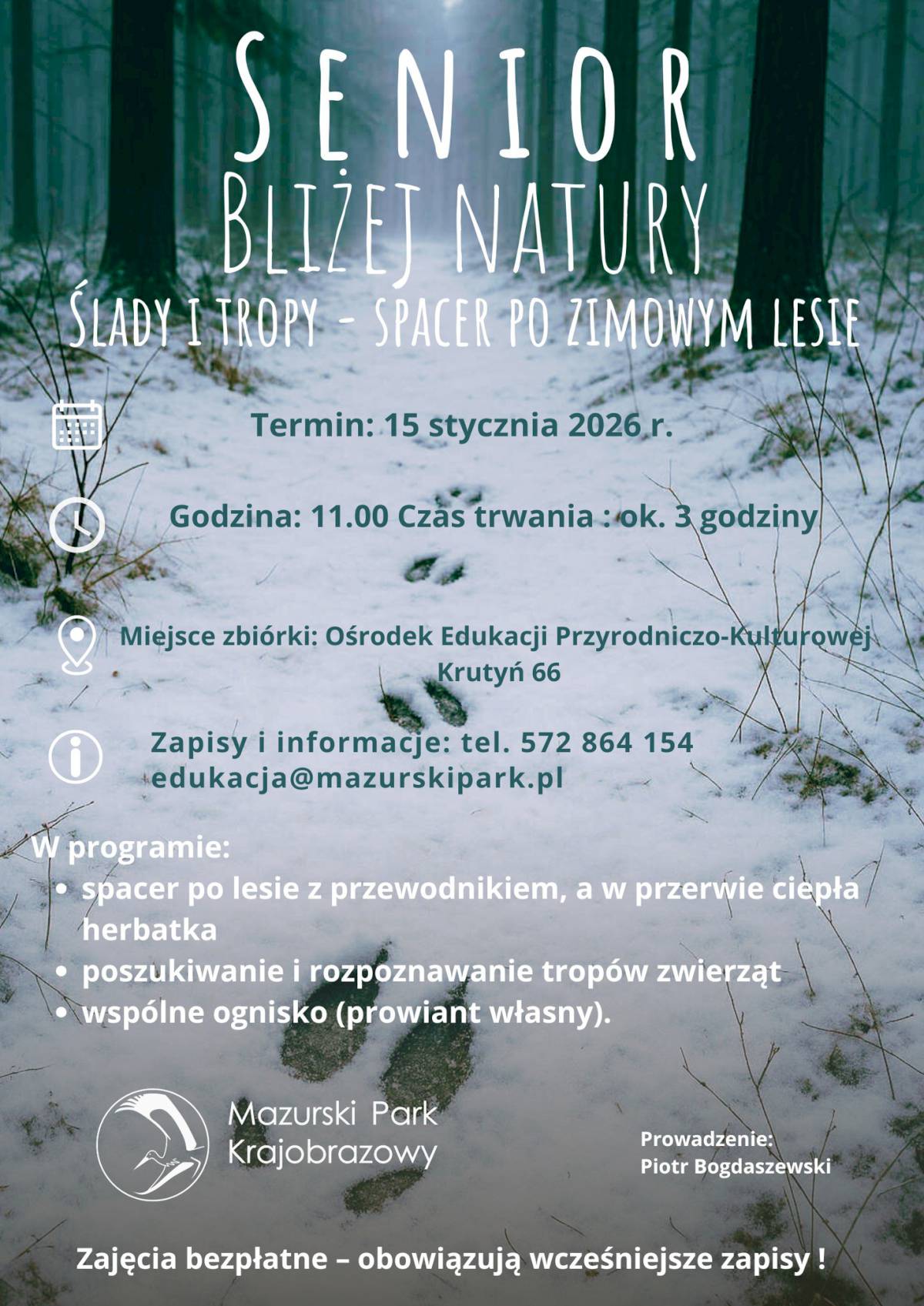 Mazurski Park Krajobrazowy zaprasza na wyjątkowe wydarzenie z cyklu „Senior bliżej natury”. Już 15 stycznia 2026 roku o godzinie 11:00 odbędzie się zimowy spacer z przewodnikiem po lesie pod hasłem „Ślady i tropy”. Spotkanie potrwa około trzech godzin i rozpocznie się przy Ośrodku Edukacji Przyrodniczo-Kulturowej w Krutyni (Krutyń 66, Gmina Piecki).