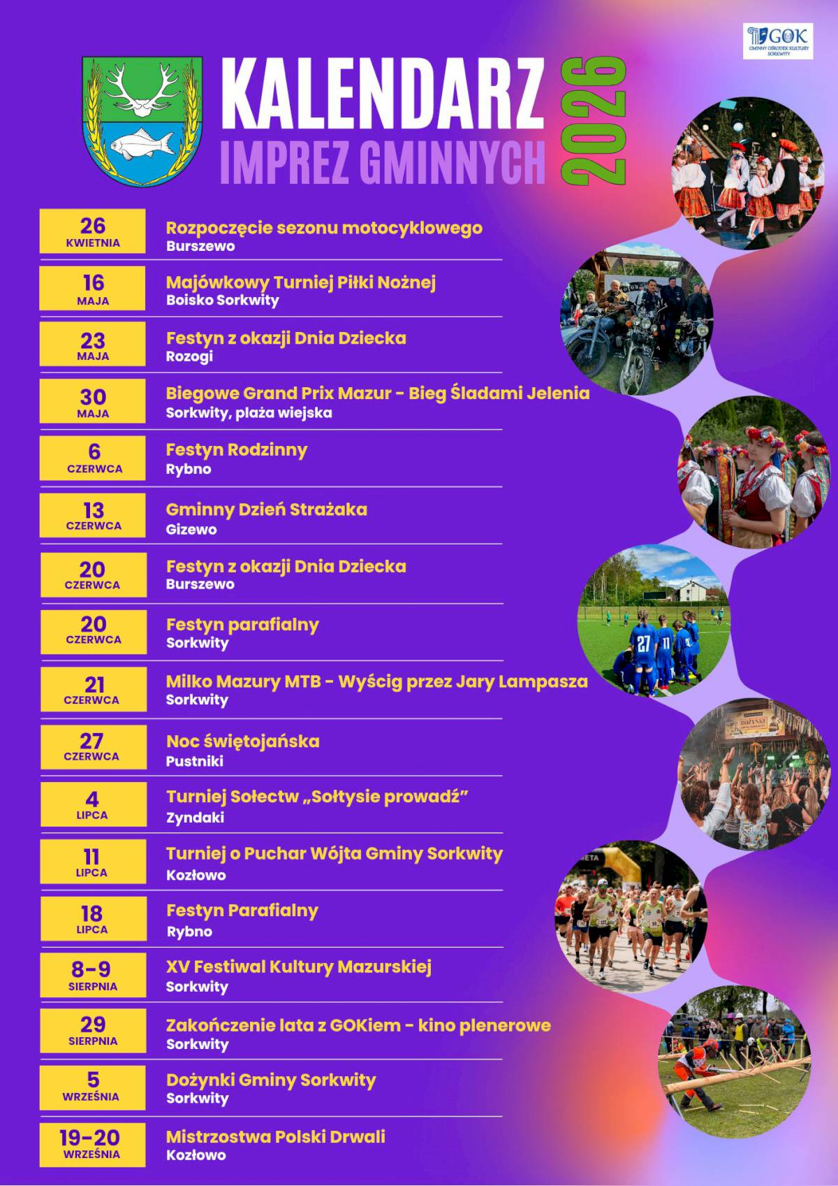 Gminny Ośrodek Kultury w Sorkwitach zaprezentował oficjalny harmonogram wydarzeń na nadchodzący sezon. Przed nami miesiące wypełnione muzyką, sportem i tradycją. Ruszamy już w ten najbliższy weekend, a to dopiero początek atrakcji, które sprawią, że tegoroczne lato na Mazurach będzie niezapomniane!