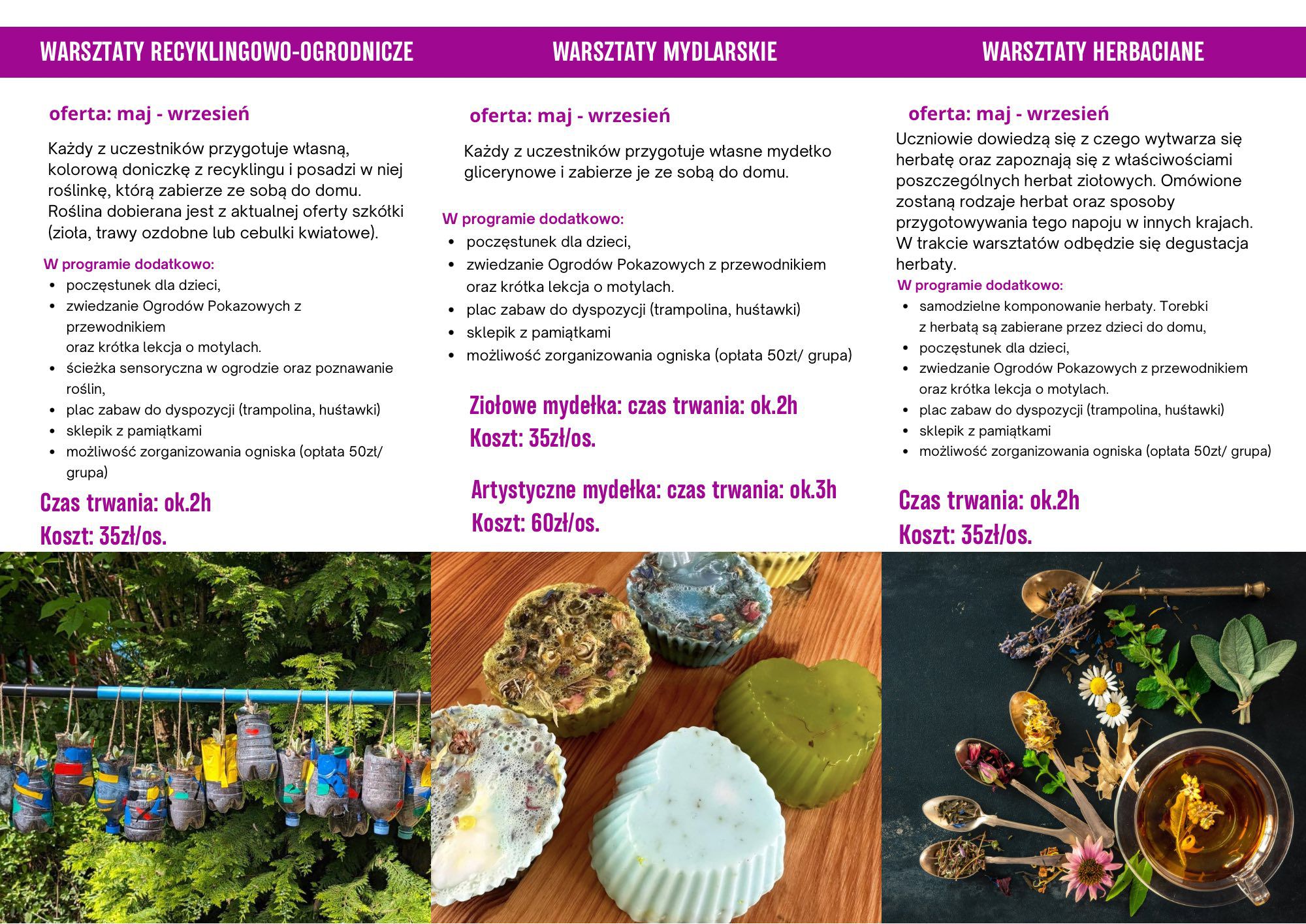 Ogrody Markiewicz to przestrzeń, w której nauka spotyka się z naturą, a dzieci uczą się poprzez doświadczenie, zabawę i kontakt z przyrodą. Warsztaty to doskonały pomysł na szkolną lub przedszkolną wycieczkę pełną inspiracji i radości.