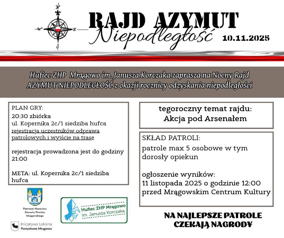 Hufiec ZHP Mrągowo im. Janusza Korczaka zaprasza na kolejną edycją Nocnego Rajdu AZYMUT NIEPODLEGŁOŚĆ!