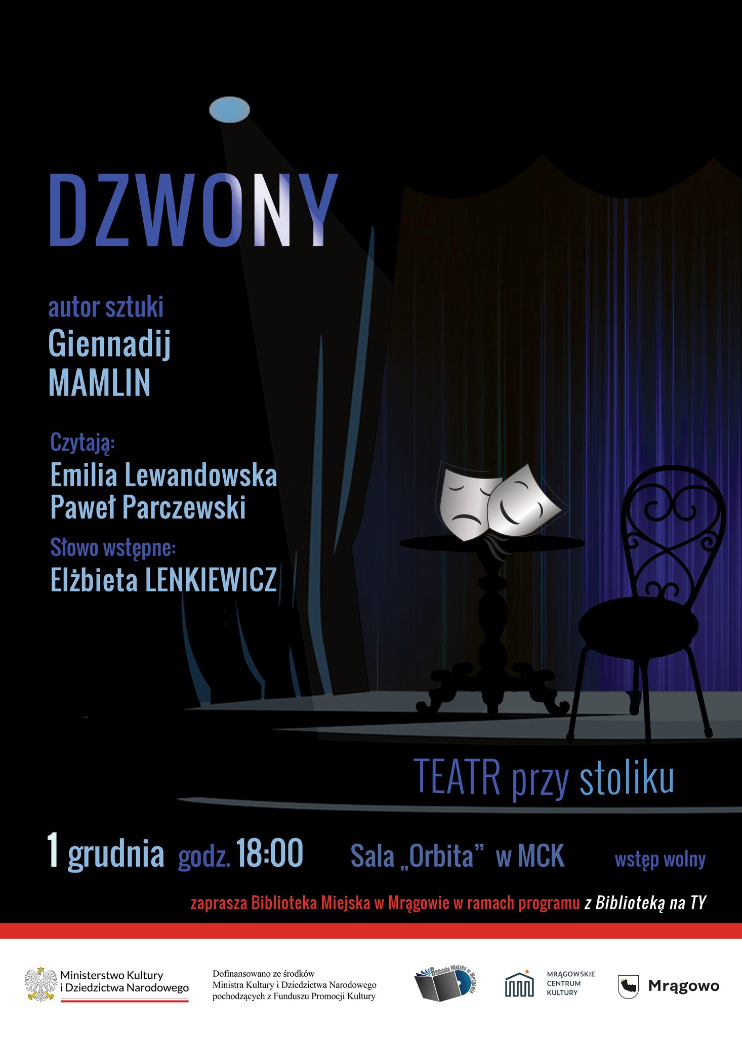 Biblioteka Miejska w Mrągowie zaprasza na kolejne spotkanie z cyklu Teatr przy Stoliku - poniedziałek, 1 grudnia 2025 r., godz. 18:00, sala Orbita w Mrągowskim Centrum Kultury. Tym razem publiczność wysłucha sztuki „Dzwony” autorstwa Giennadija Mamlina – poruszającej, lirycznej opowieści o spotkaniu dwojga ludzi pochodzących z odmiennych światów mentalnych i kulturowych.